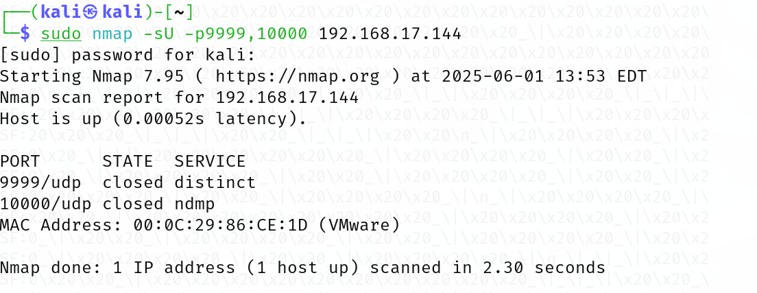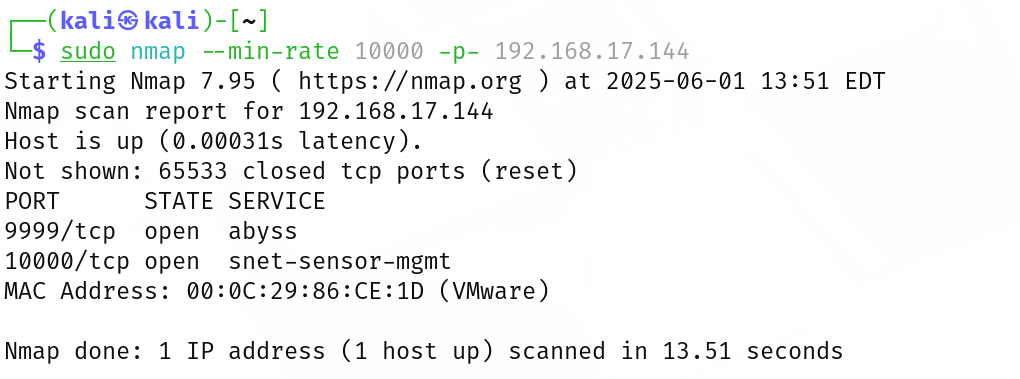 ┌──(kali㉿kali)-[~] └─$ sudo nmap -sT -sV -sC -O -p9999,10000 192.168.17.144 Starting Nmap 7.95 ( https://nmap.org ) at 2025-06-01 13:54 EDT Nmap scan report for 192.168.17.144 Host is up (0.00083s latency).