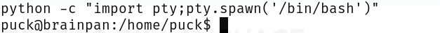 puck@brainpan:/home/puck$ sudo -l sudo -l Matching Defaults entries for puck on this host: env_reset, mail_badpass, secure_path=/usr/local/sbin\:/usr/local/bin\:/usr/sbin\:/usr/bin\:/sbin\:/bin