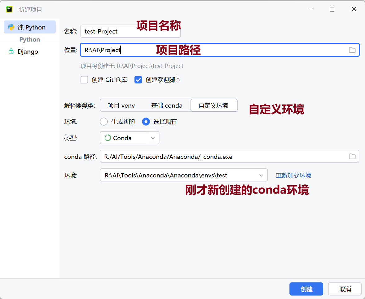 1.给项目配置 anaconda 环境, python 解释器配置(参考项目配置)