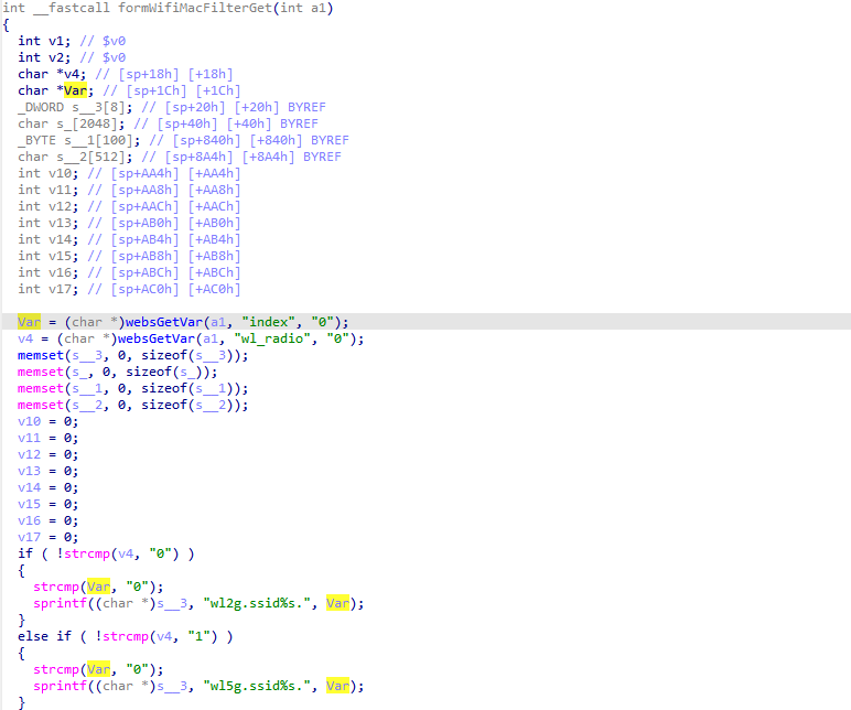 If the value of wl_radio is not 0, the variable Var will be passed to the sprintf function without any length check, which may overflow the stack-based buffer s__3.