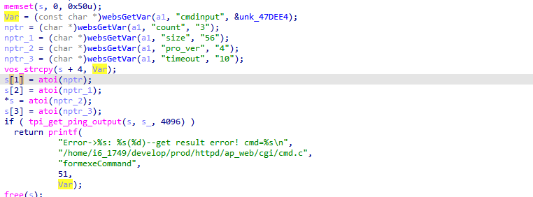 and the variable Var is passed to the vos_strcpy function without any length check, which may overflow the stack-based buffer s.